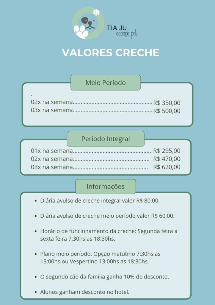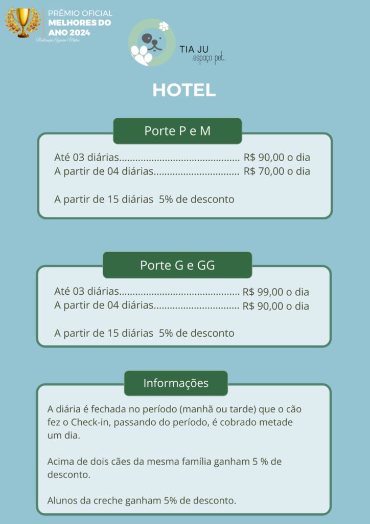 EXCELENTE Com base em 24 avaliações Publicado em Claudinei Bittencourt14/06/2023Trustindex verifica se a fonte original da avaliação é Google. TopPublicado em Ubirajara Arruda20/03/2023Trustindex verifica se a fonte original da avaliação é Google. Muita qualidade e atenção com meu pet, lugar amplo e arejado. Pelo que vi, profissionais com grande qualificação. Recomendo de olho fechado.Publicado em Benta Jardim05/03/2023Trustindex verifica se a fonte original da avaliação é Google. Ótimo hotel eu recomendo e sempre levo meu Pet na Tia jú ótimo ProfissionaisPublicado em sheila pires01/03/2023Trustindex verifica se a fonte original da avaliação é Google. Ótimo local super indico já conheço á alguns anos,levo á nunca cachorrinha Susi ,na saída d carro éla saí correndo para entrar na Tia Jú, kkkk quando vou buscar éla vem cançada d tanto brincar .Obrigado por fazer éssas brincadeiras com os dogs pois não temos espaço em casa,éla nunca veio machucada e com medo d algo ,obrigado tio Will e tia júPublicado em Maria Lúcia Voto01/03/2023Trustindex verifica se a fonte original da avaliação é Google. Segundo lar dos meus filhos 🐾, Conheci desde o começo. Fui a primeira cliente e nunca mais larguei. Rs Confio de olhos fechados, tanto que o Gato e Cali já passaram longos períodos de hospedagem (mais de mês), sem falar da diversão garantida na creche semanal. Lugar limpo, seguro e o principal, cheio de amor! Ju, Wil e toda a equipe, Gato, Cali e eu agradecemos o carinho e cuidado desde sempre.Publicado em Su Reges01/03/2023Trustindex verifica se a fonte original da avaliação é Google. Lugar incrível, com pessoas incríveis que realmente amam o que fazem !!! Infelizmente é triste ver um comentário tão maldoso e sem verdades tentando manchar a imagem do local de pessoas honestas e dedicadas ao que fazem e principalmente amam os pets conheço vcs e o local isso jamais irá tirar a credibilidade e a confiança que temos em deixar nossos cãozinhos tão amados com vcs ! Continuem assim pois a lei do retorno e a Deus nunca é falha meus queridos contêm comigo sempre adoro vcs e o lindo trabalho que fazem !!!! #A concorrência é escrupula e sem limites quanta falta de verdades triste viu...Publicado em Rodrigo Santelli01/03/2023Trustindex verifica se a fonte original da avaliação é Google. Meus pets sempre ficam aos cuidados da creche e são sempre muito bem tratados. Tem um que as vezes não quer nem voltar pra casa! Ótimos profissionais RecomendoPublicado em Anderson Severo Jardim01/03/2023Trustindex verifica se a fonte original da avaliação é Google. Eu deixo o meu cachorro Scooby ,na Tia Jú já faz 3 anos ele sempre foi bem cuidado isso q ele já é um cão idoso ótimo tutores e professores eu só tenho á agradecer e eu confio pelnamente nos cuidados eu sempre indico á Tia Jú.Publicado em Juan Carlos Spataro01/03/2023Trustindex verifica se a fonte original da avaliação é Google. Amam os cães e tem um trabalho impecável com eles.Melhor hotel e creche da região! Recomendamos de olhos fechados